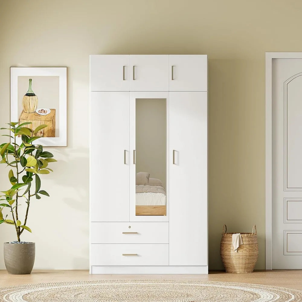 Wooden 3-Door Wardrobe with Mirrored Door and Upper Cabinet, Closet Organizer featuring Hanging Rail, 2 Drawers, and 4-Tier Stor