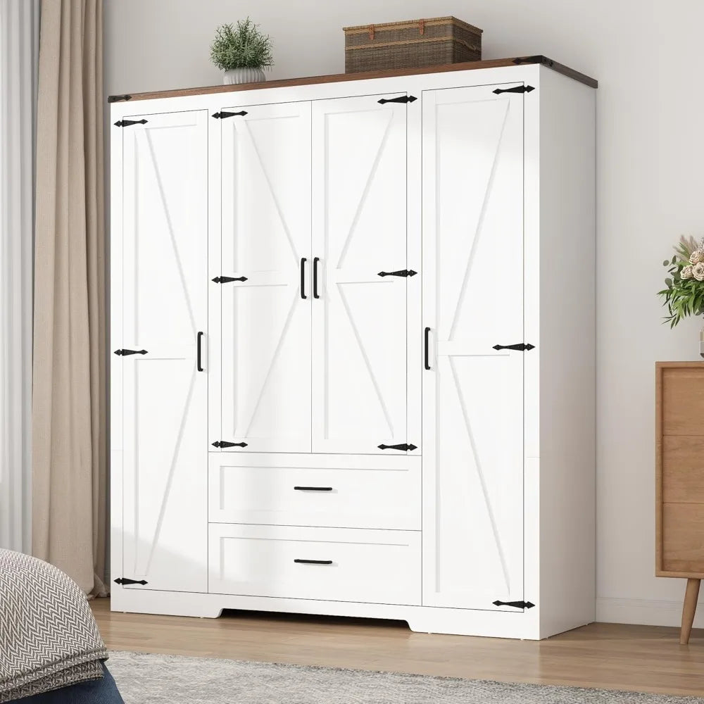 4 Doors Wardrobe Armoire Closet with Doors and Drawers, Farmhouse Wooden Armoire Storage Cabinet with Shelves & Hanging Rod for
