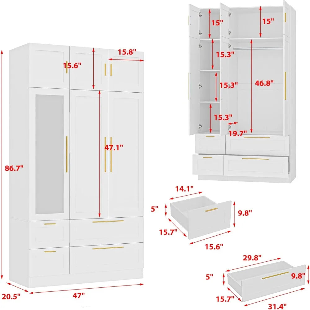 Modern White Bedroom Armoire with Mirror, 3-Door Wardrobe featuring Hanging Rod, 4 Drawers, and Shelves, Accented with Gold Hand