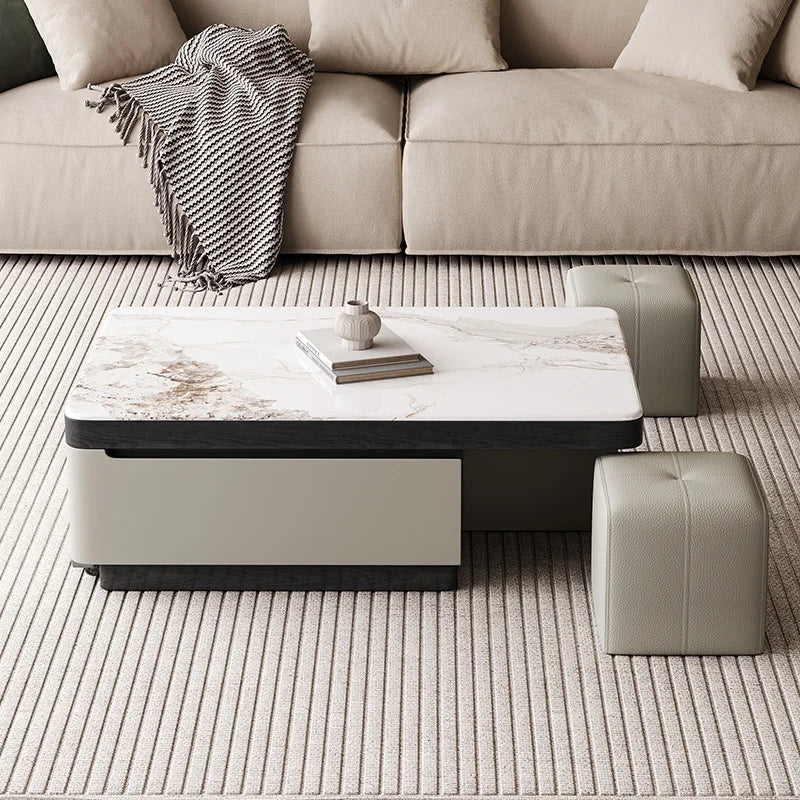 Expandable Coffee Table with Storage Drawer Modern Living Room Center Table with Hidden Stools Simple Tea Tables for Small Space