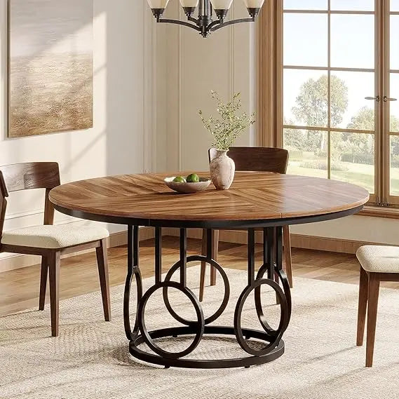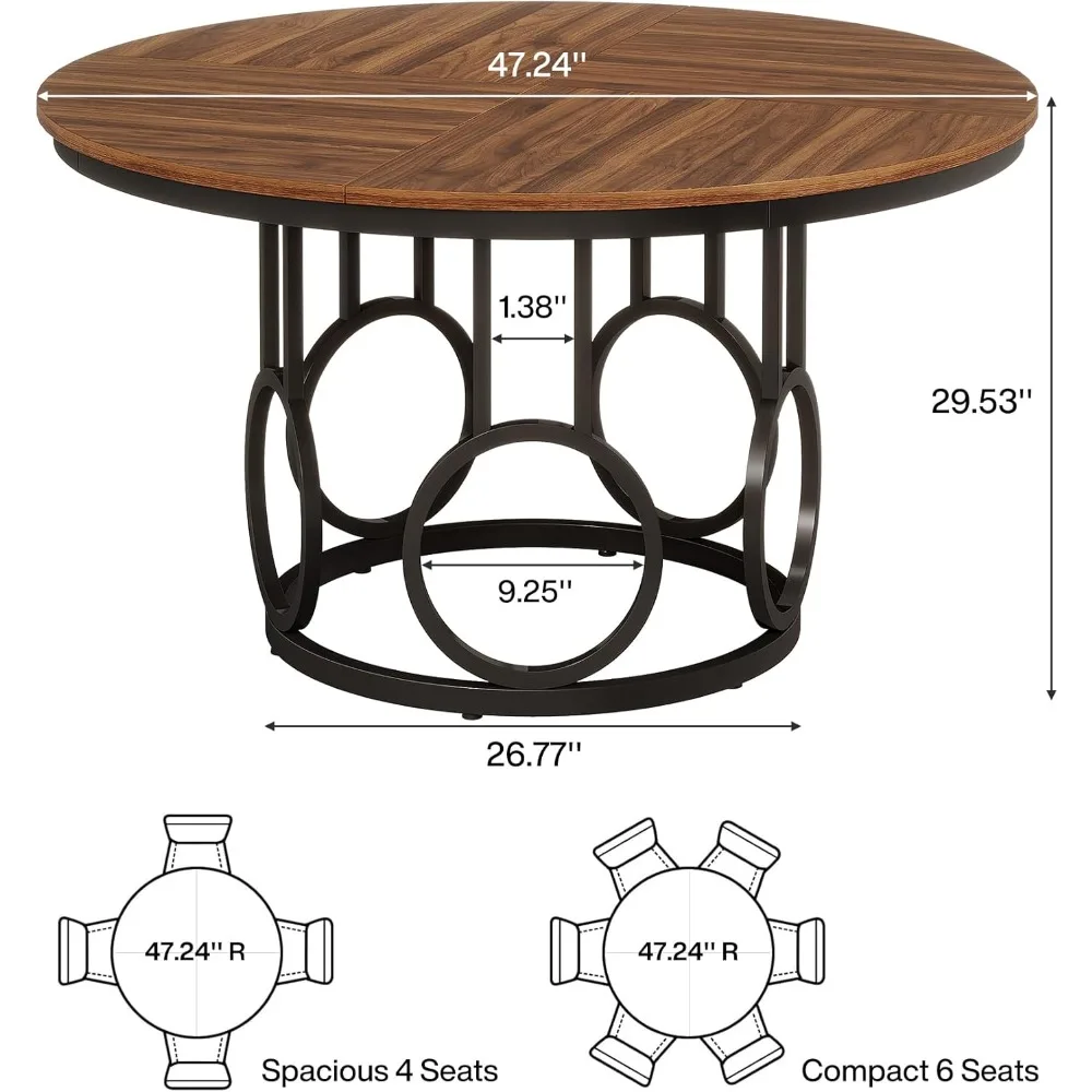 This round dining table offers a classic country style with its elegant combination of walnut wood and black metal, adding a cozy touch to your dining area. It's crafted to enhance family meals and festive gatherings, providing a warm ambiance. Measuring 47.24 inches in length and width, and standing at 29.53 inches tall, this table is spacious enough to accommodate 4 to 6 diners comfortably, with plenty of room for serving food, drinks, and decorative elements. It's suitable for daily dining as well as hosting guests. Built with durability in mind, the table features a high-quality MDF top and a robust metal base. The black powder-coated base not only ensures the table's longevity but also adds a modern aesthetic to your dining space. The table's round shape makes it a space-saving option that can fit into smaller dining areas. It can serve as a dining table, living room centerpiece, or coffee table, making it ideal for game nights, family dinners, and social events. Assembly is straightforward with all required tools and clear instructions included. We are dedicated to your satisfaction and offer full support to ensure the product is installed with ease.