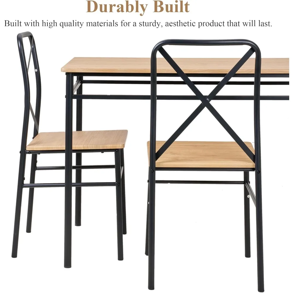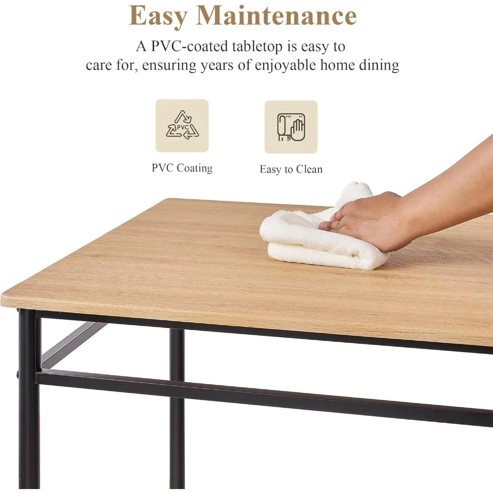 Here's a rewritten product description based on the provided information: This kitchen table and chair set combines modern simplicity with rustic charm, featuring wood panels that have a realistic wood grain pattern. The mix of natural wood tones with black and white creates a low-key yet inviting atmosphere, perfect for relaxed dining. The set includes four ergonomically designed chairs with curved backrests and smooth seats, ensuring comfort during every meal. The table and chairs are made from premium thick MDF, sanded to a smooth finish, and supported by a sturdy metal frame. Each piece is durable and can hold up to 180 pounds for the table and 300 pounds for the chair. This compact set is ideal for small spaces, providing ample legroom without taking up too much room. After meals, chairs can be easily slid under the table for a clutter-free appearance. Its minimalist design makes it versatile for various settings, including homes, cafes, restaurants, and shopping spaces. The table and chairs are easy to clean, with spills and stains being no match for a quick wipe with a cloth.