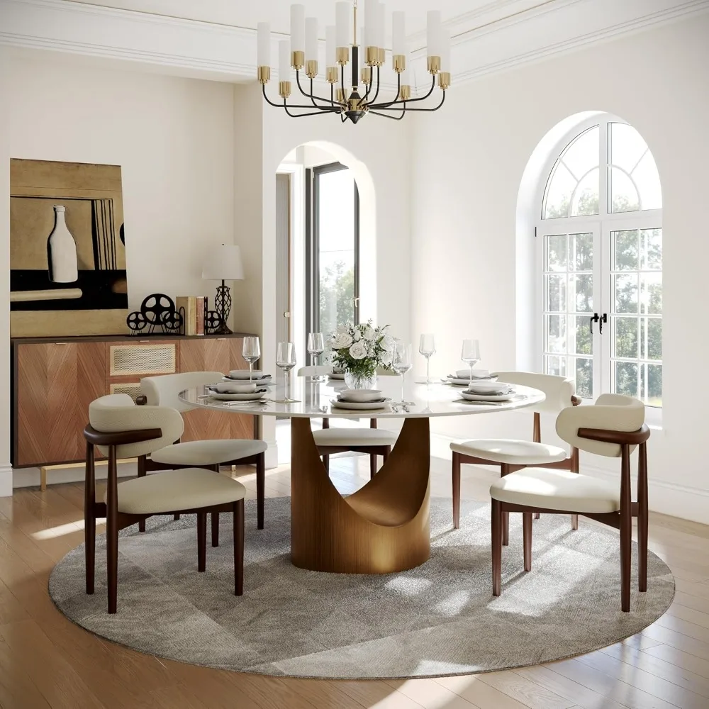 - Premium Glossy White Sintered Stone Dining Table (TABLE ONLY): chic round dining table for 6 is equipped with 12mm glossy sintered stone tabletop, also with distinctive smile-like curved metal base design ensures stability, durability, and adds a stylish, modern touch to your dining space