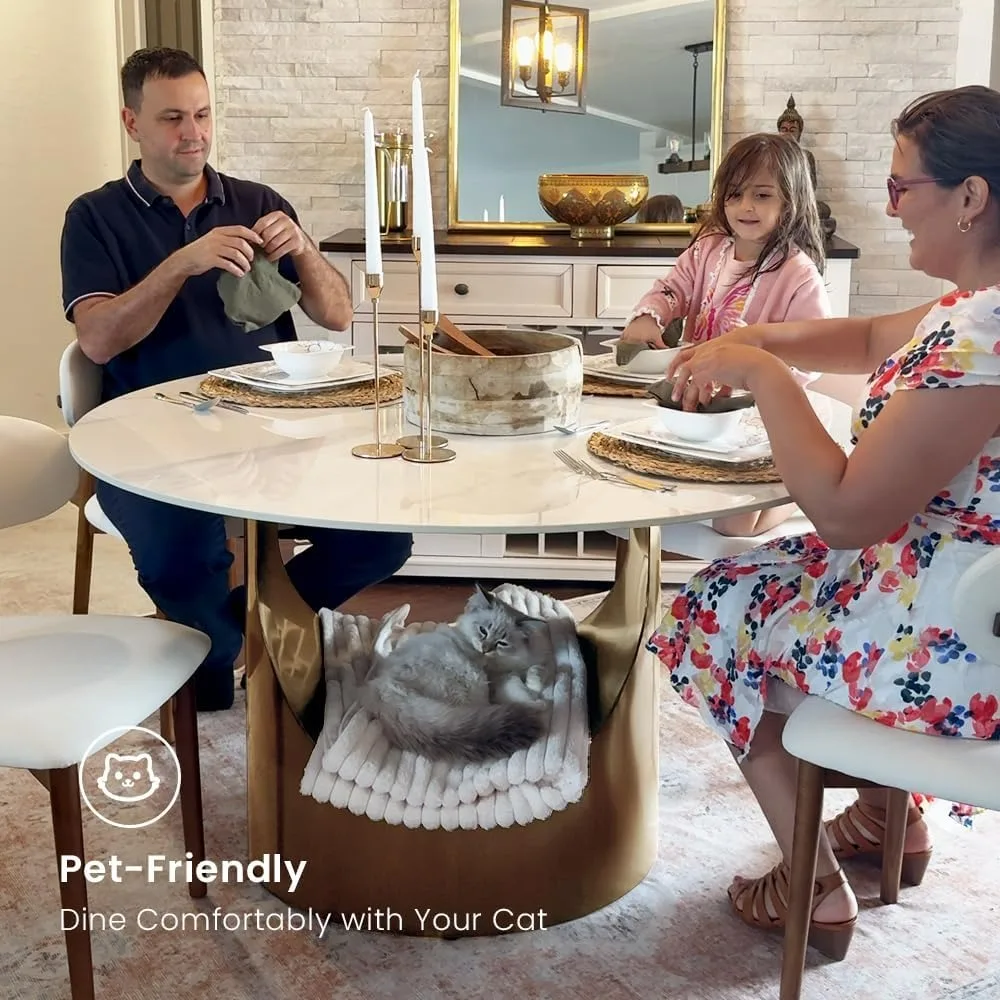 - Smooth Edge Design: The dining tabletop pattern is glossy white marble. Thickness of the tabletop is 12mm, and the edge of the tabletop adopts a humanized smooth edge design to prevent collision, making your family and pets feel more at ease at home. The size of this round dining table is 59 inches, table is recommended for 4-6 people