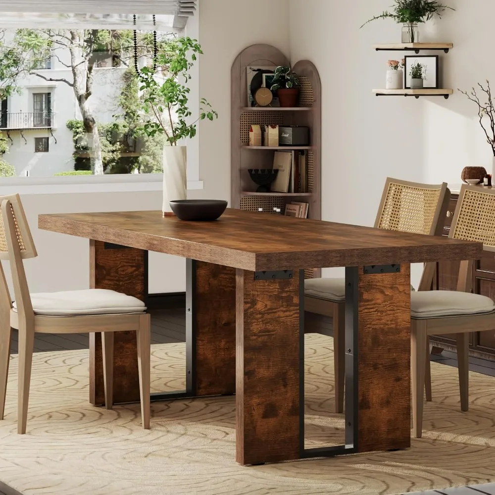 - [Farmhouse Dinner Table with Sturdy Construction] - The table is meticulously engineered for long-lasting durability. It boasts a high-quality thick board and steel construction, with a stable rectangular frame measuring 1.57" by 0.78" in width. This robust structure guarantees that the table can effortlessly withstand heavy-duty loads without compromising its stability. Rest assured, this table is built to last, providing you with a reliable and sturdy surface for all your dining and entertaining needs.