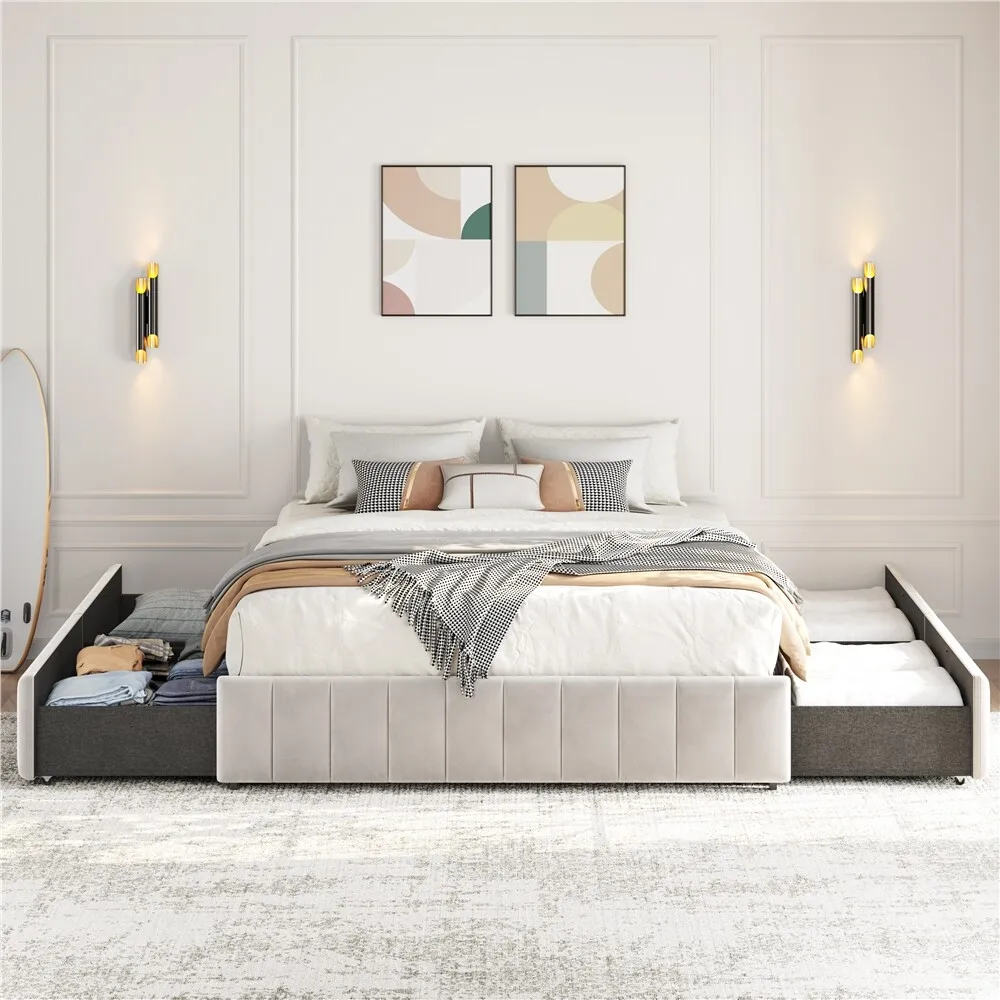 【Large Storage】The upholstered storage bed has 4 large drawers, each measuring 79 cm x 51 cm x 13.7 cm/31 ″ L x 20 ″ W x 5.4 ″ H with a volume of 55 L. With the ability to slide outward and backward, you can easily manage your household items, with no more clutter.