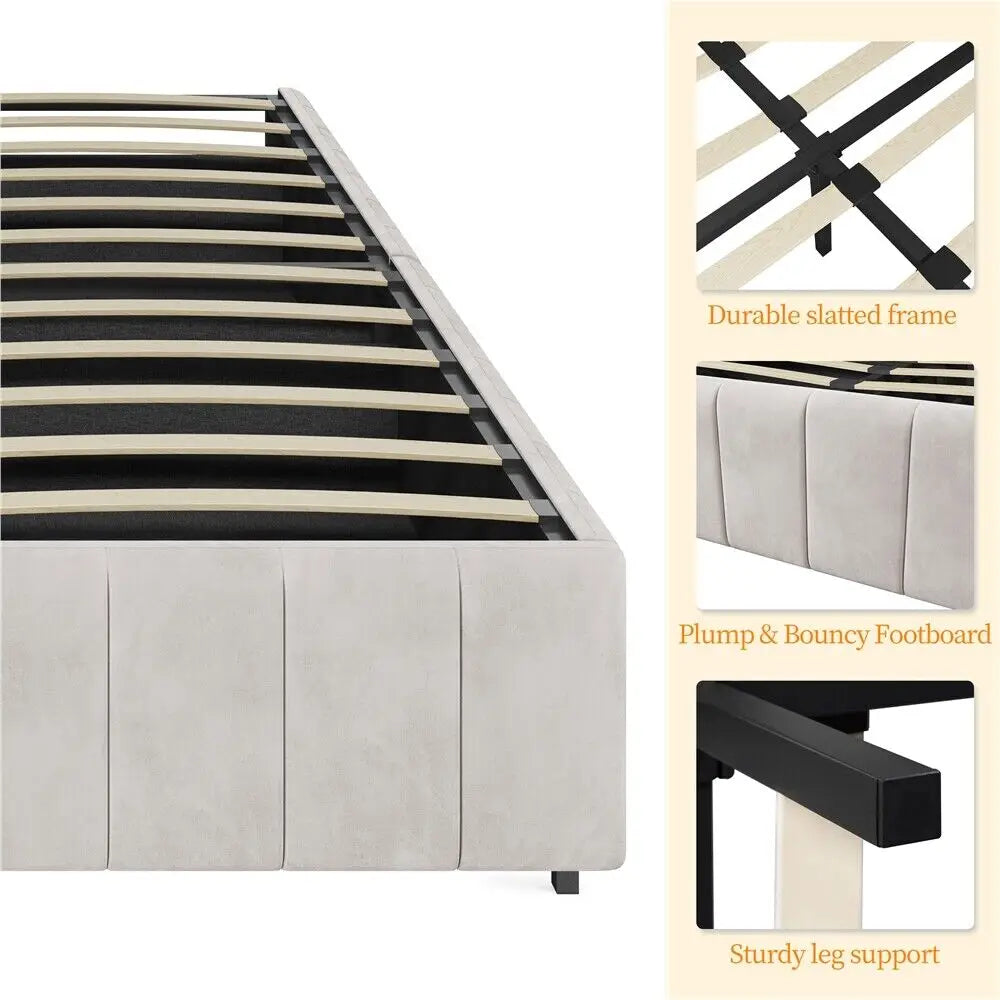 【Simple & Modern】 Low-profile frame opens up any room. Modern design with a simple color fits various types of home decor. The striped pattern of the side panel combined upholstered bed frame enriches your room with a classic and chic look.