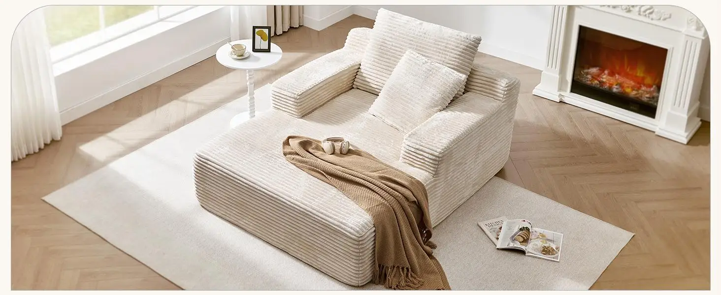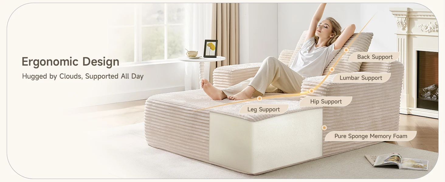 65" oversized chaise lounge features extra-deep seating (31.5" seat depth) for full-body relaxation. Perfect for movie nights, reading marathons, or luxurious naps. Accommodates users up to 6'5".