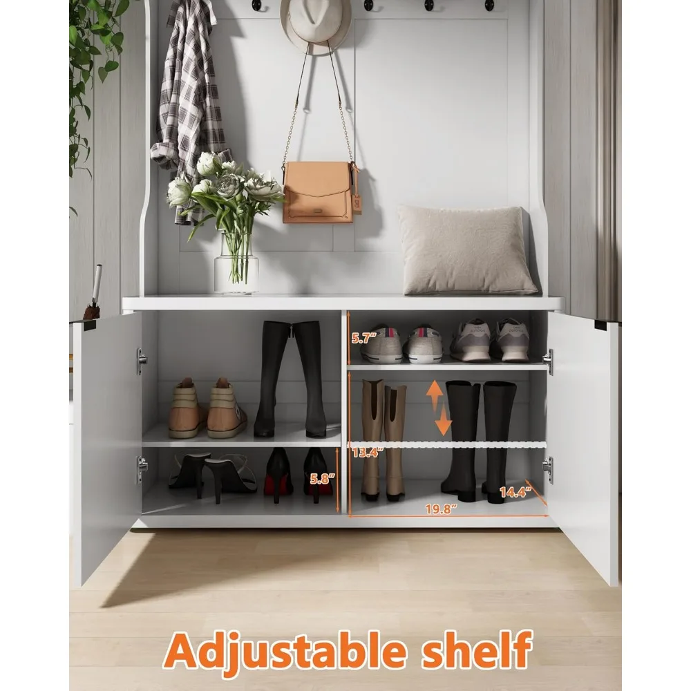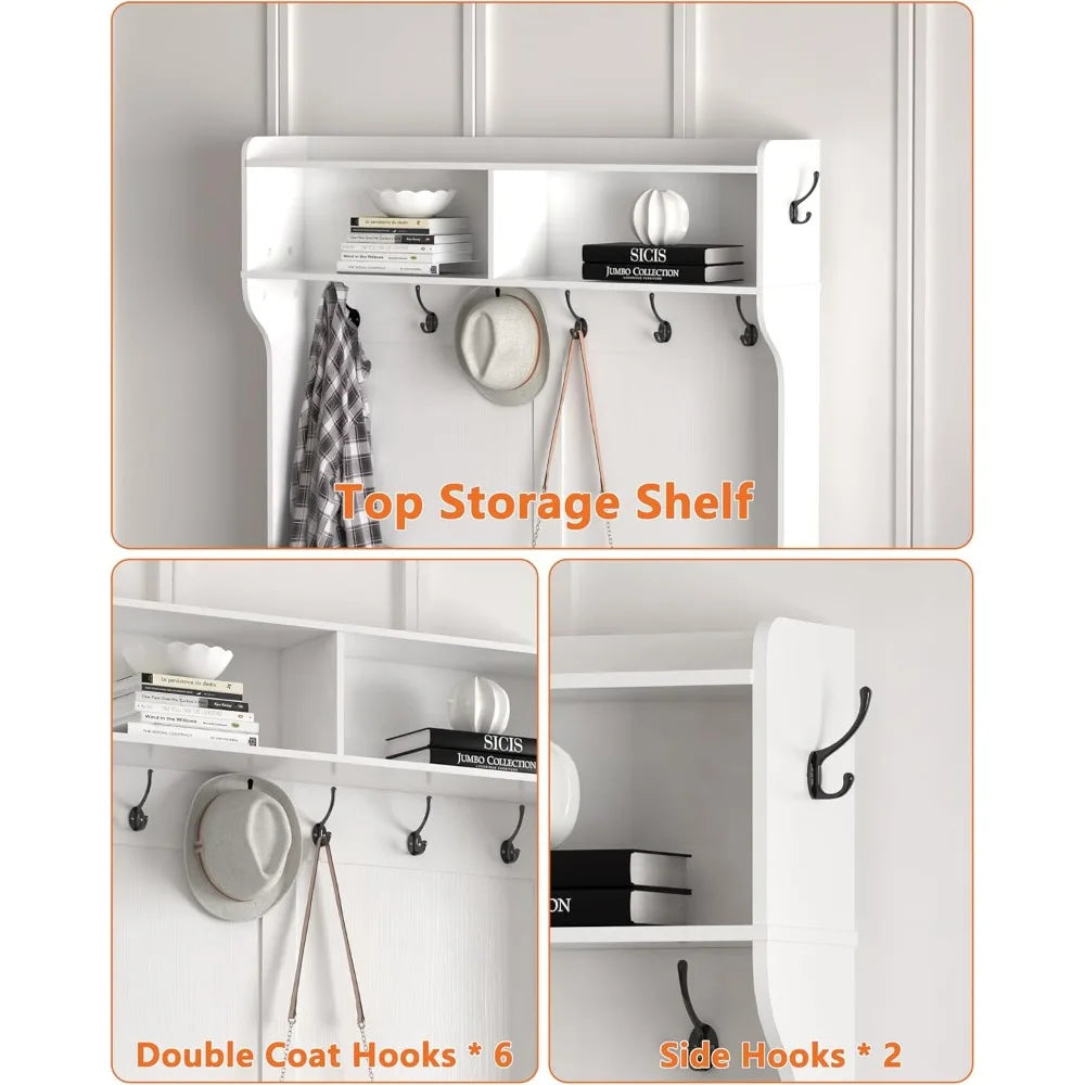 - 【Multifunctional 4-in-1 Design】This versatile hall tree integrates 6 hooks (including 2 side hooks), 2 spacious top compartments, a shoe cabinet, and a shoe bench, offering an all-in-one storage solution for your entryway.