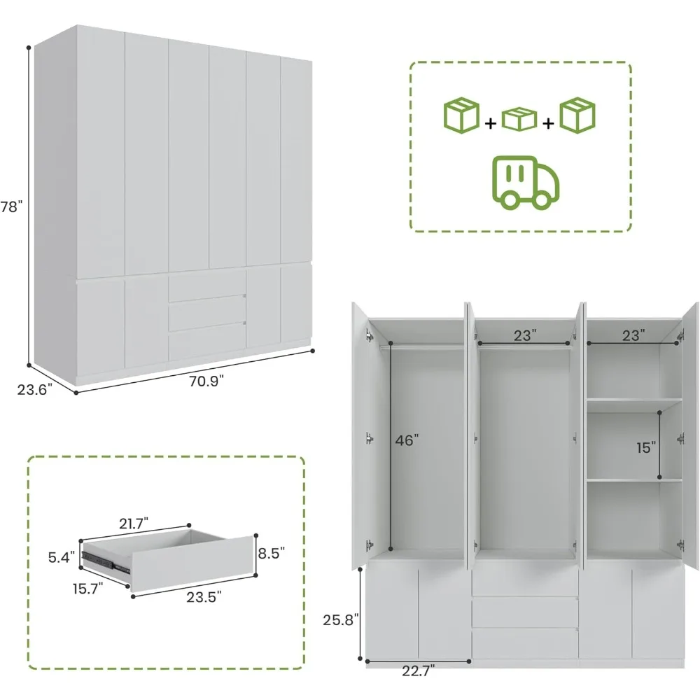 - 【Easy to Assemble】 The bedroom wardrobe will be packed in 3 boxes, which may not arrive at the same time. Please make sure you have received all accessories before installation, and detailed instructions and tools are included in the package. All parts are labeled and it is clear to assemble, and you will not be stuck in assembly difficulties. Overall Dimensions: 70.9" W x 23.62" D x 78" H.