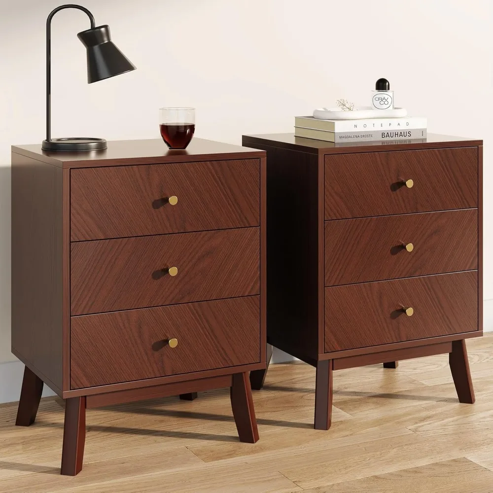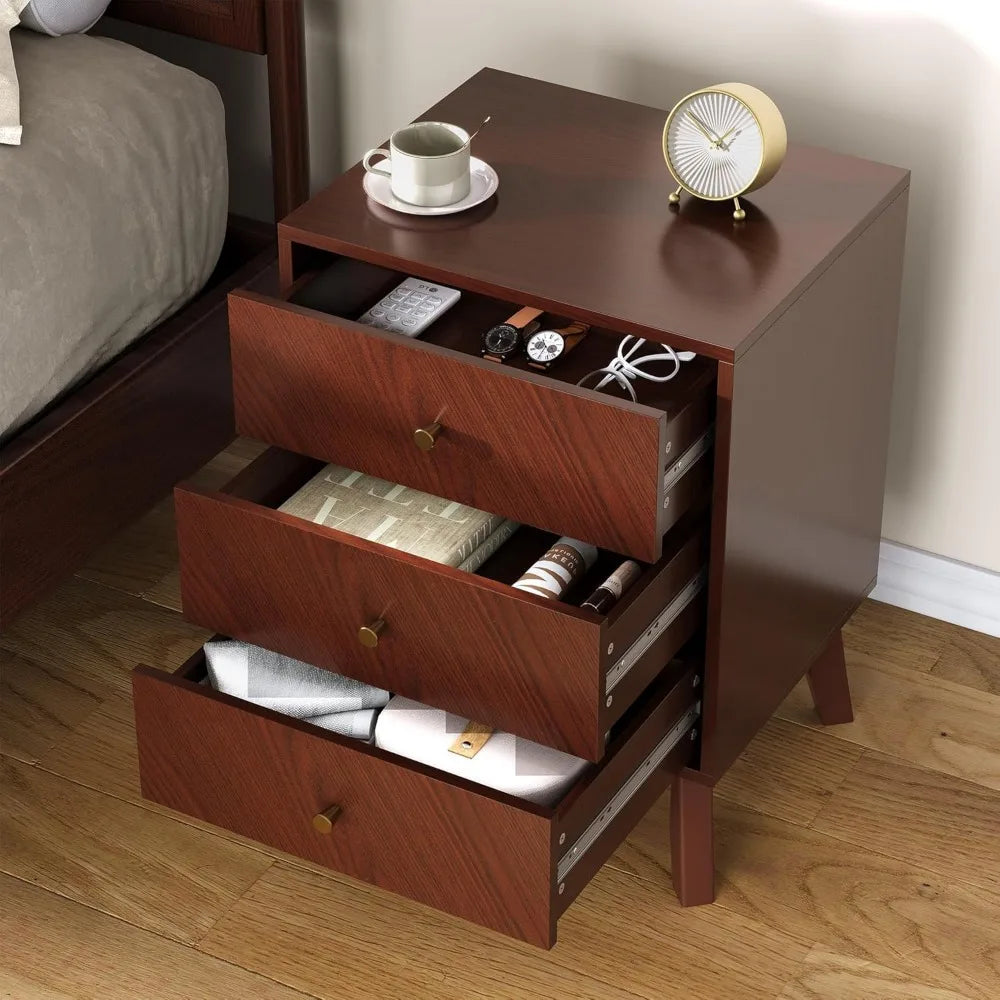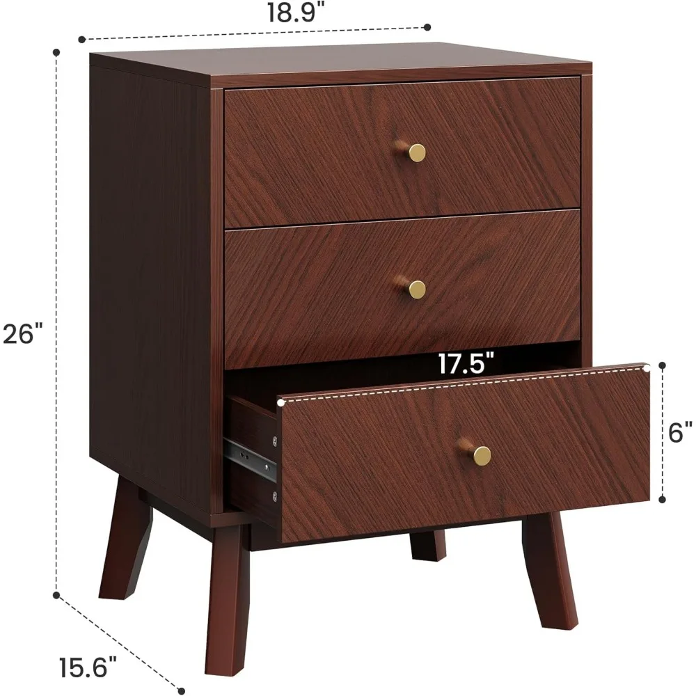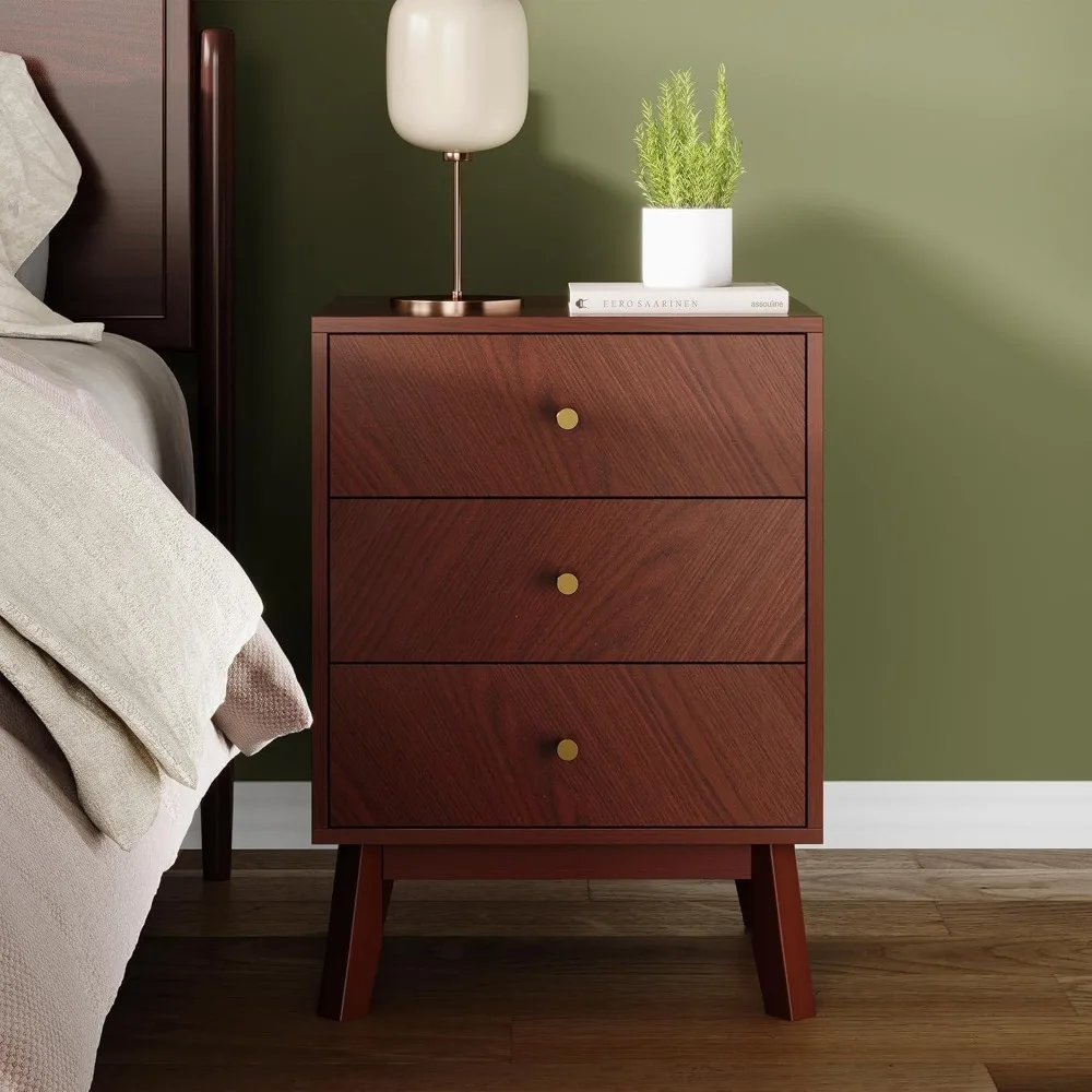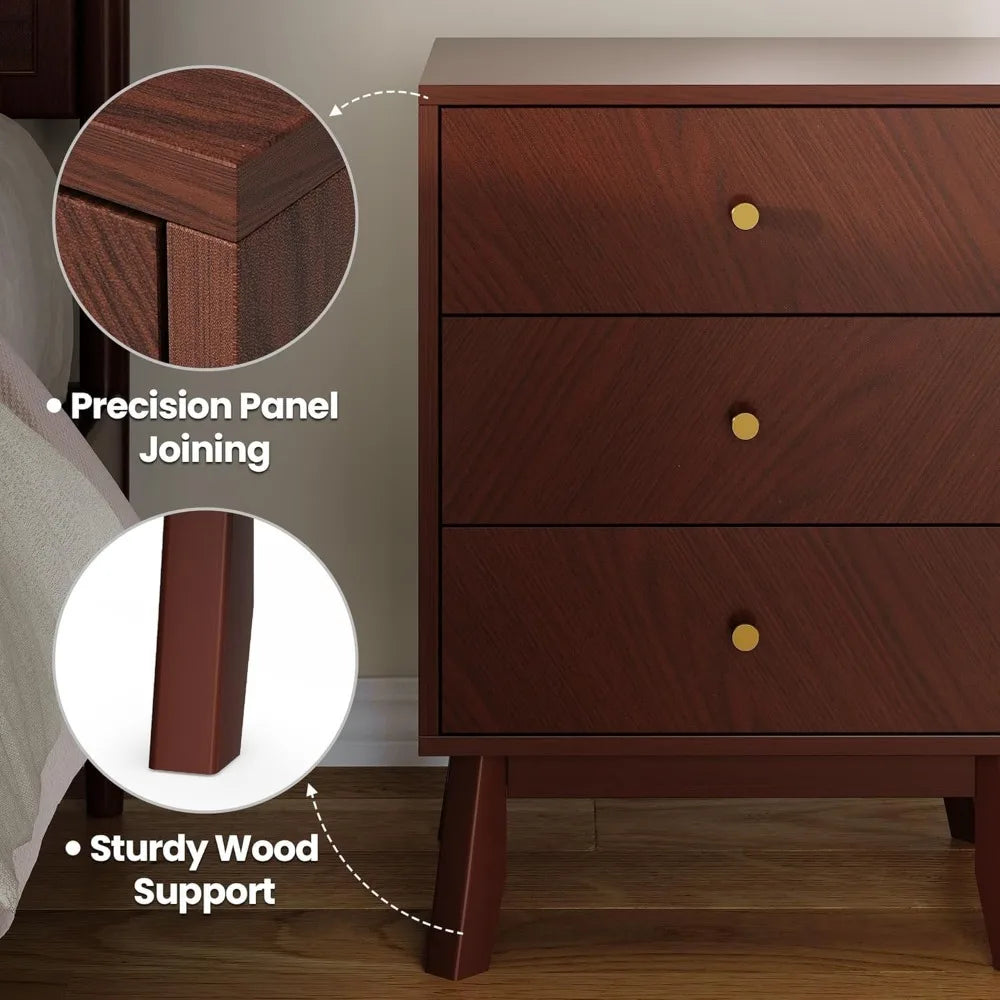 - Warm Mid-Century Modern Style: Crafted in a rich cherry wood finish, this 3 drawer nightstand blends clean lines, angled legs, and gold knobs for timeless mid-century charm. At 26” tall, it pairs beautifully with Queen or King beds, creating a warm and stylish bedroom nightstand.