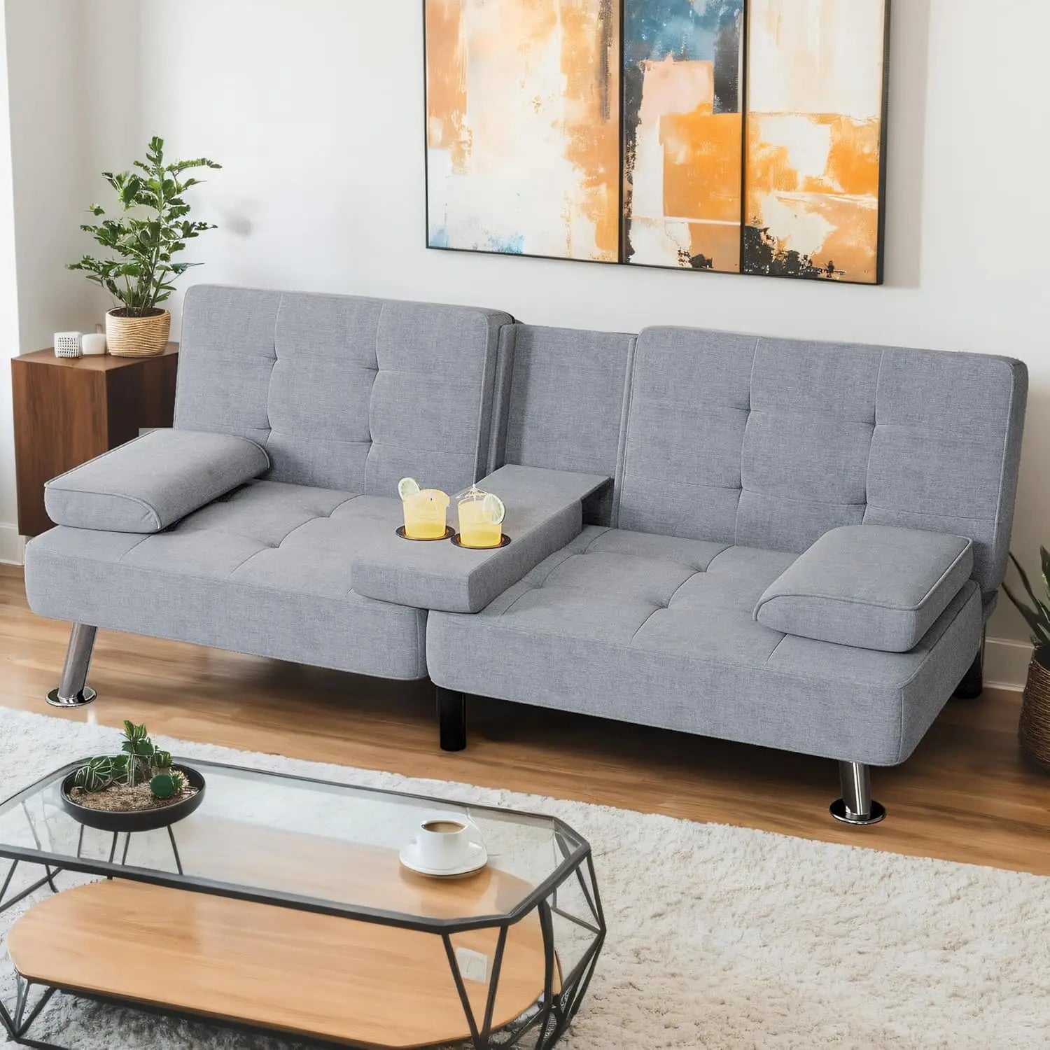 Seating for 2: With a weight capacity of up to 500lbs, this stylish futon sofa allows you to lounge in comfort while preventing your favourite drink with the cup holder in the middle!