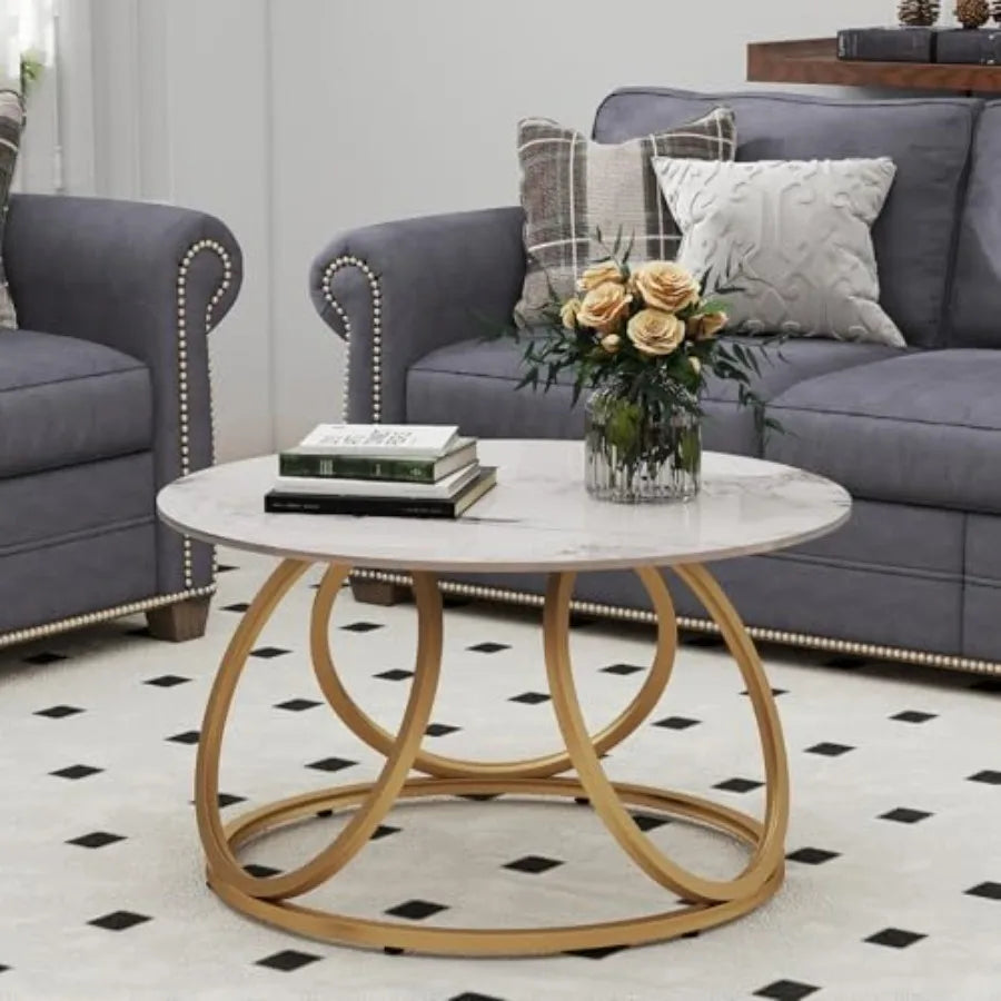 Round Coffee Table for Living Room Modern Coffee Table with Marbling tural Stone Gold White