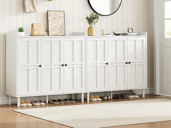 This 3-door shoe cabinet elegantly conceals up to 30 pairs (size dependent) with dedicated vertical storage for boots and high-tops. Features an organizational system that eliminates shoe chaos while maintaining quick access to everyday footwear.