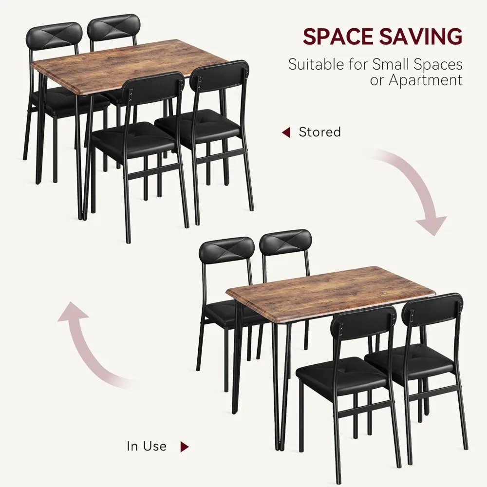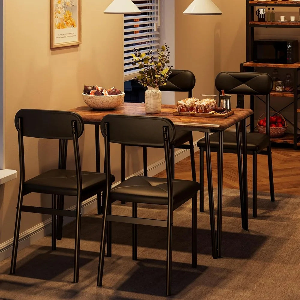 This versatile dining table set is designed to blend seamlessly into various spaces such as kitchens, dining rooms, open living areas, home offices, bars, restaurants, coffee shops, and small apartments. It provides ample space for social gatherings, meals, afternoon tea, or work sessions, effortlessly transitioning between different modes like dining, office, computer, workstation, breakfast nook, and relaxation. The set is perfect for accommodating diverse needs and lifestyles. Our upgraded seat cushions and ergonomic backrests offer luxurious comfort for extended periods of sitting during meals, work, or leisure. Crafted with sturdy metal frames, these seats provide a superior level of comfort and durability, creating a cozy atmosphere for any occasion. The set is built for stability and durability with high-quality MDF tabletops, reinforced metal frames, and upgraded chair cushions. Enhanced with additional steel bars, it can securely hold up to 550 pounds, ensuring stability and reliability for years to come. Enhance your home decor with our unique and stylish dining table and chair set. Each tabletop color—vintage, grey, or black—features a captivating grain texture, adding an elegant and sophisticated touch to your space. This set is perfect for enhancing your home's ambiance and creating a memorable dining experience. Maximize your home's space with this set, as the chairs can be effortlessly tucked under the table, freeing up valuable floor area. Ideal for small spaces, this set offers ample room for family activities while ensuring a clutter-free and functional living environment.