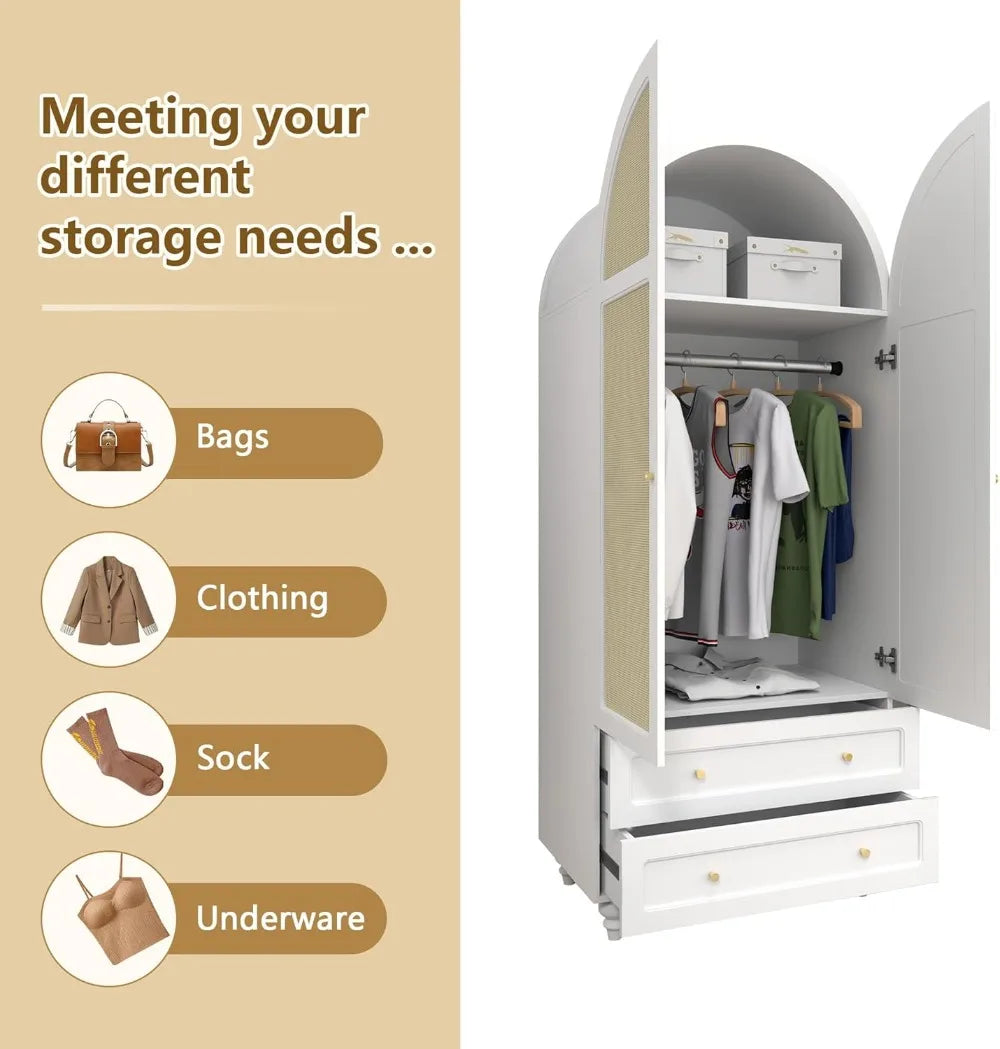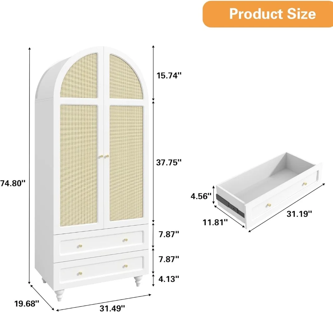 - 【 Style and Appearance 】 The arched wardrobe with rattan door design has strong classic elements, which can seamlessly integrate with various home decoration styles such as modern, contemporary, farmhouse or leisure, making your home easy to have a different sense of beauty and warmth